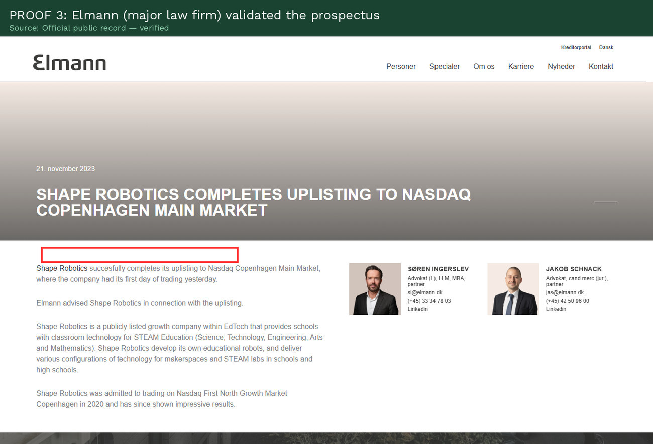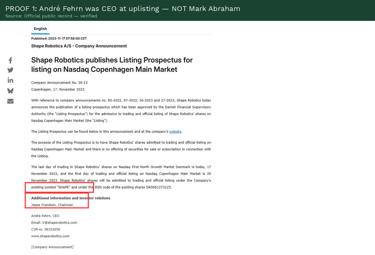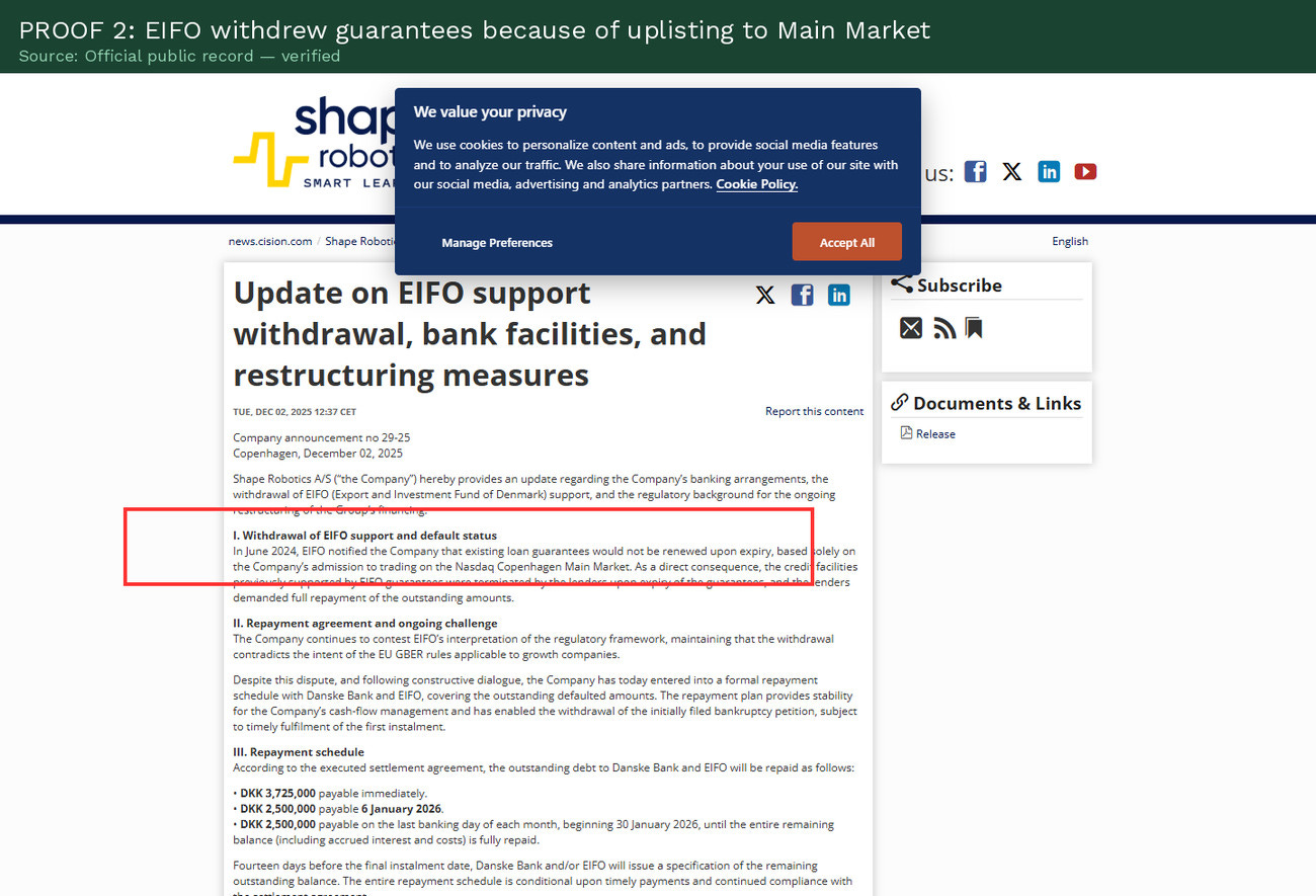 The timeline, verified by official Nasdaq company announcements: November 17, 2023 — Shape Robotics publishes its Listing Prospectus for Nasdaq Copenhagen Main Market. EIFO-backed credit facilities presented as a pillar. November 20, 2023 — Shape begins trading on Nasdaq Copenhagen Main Market. May 1, 2024 — I become CEO. I was not part of the uplisting process. June 2024 — EIFO notifies the company that loan guarantees will not be renewed because the company was admitted to trading on Nasdaq Main Market.