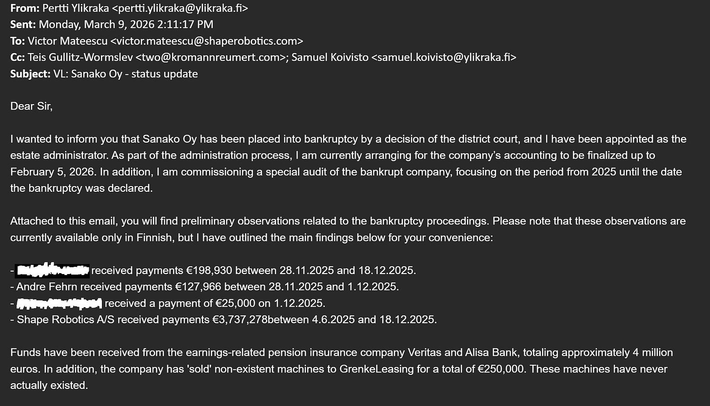 On January 6, 2026, Shape Robotics AS was declared bankrupt in Denmark. Teis Gullitz-Wormslev of Kromann Reumert was appointed as curator. For 59 days, he controlled the company.