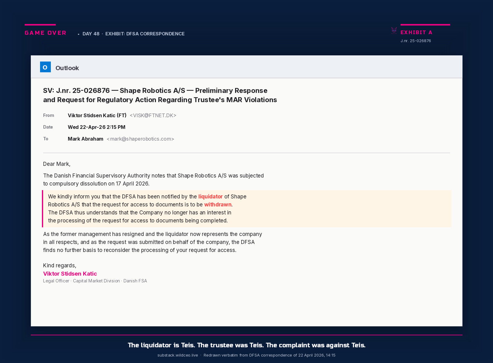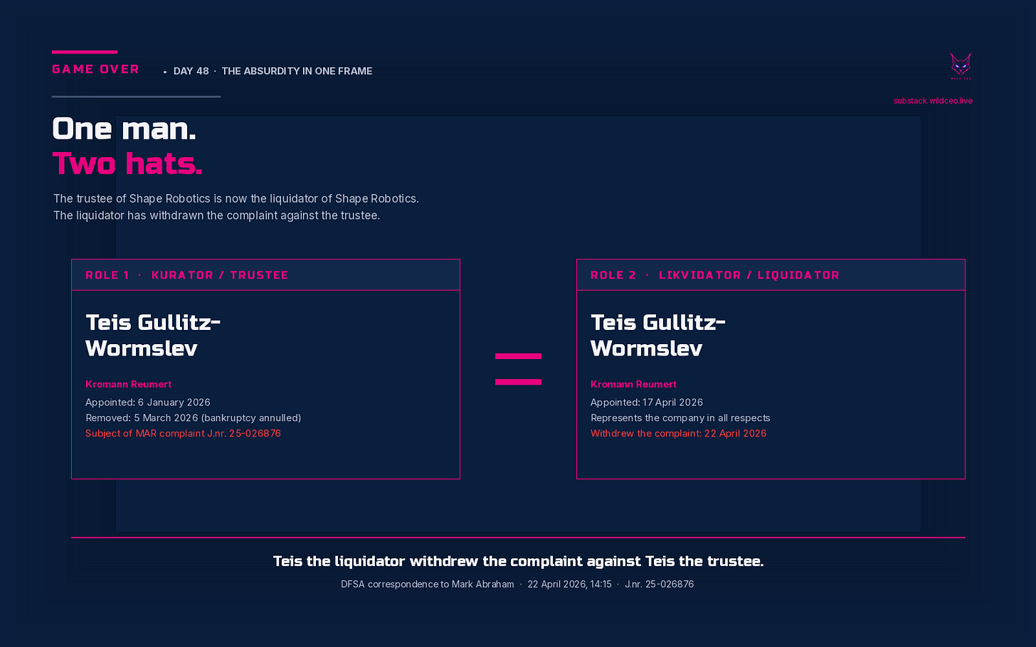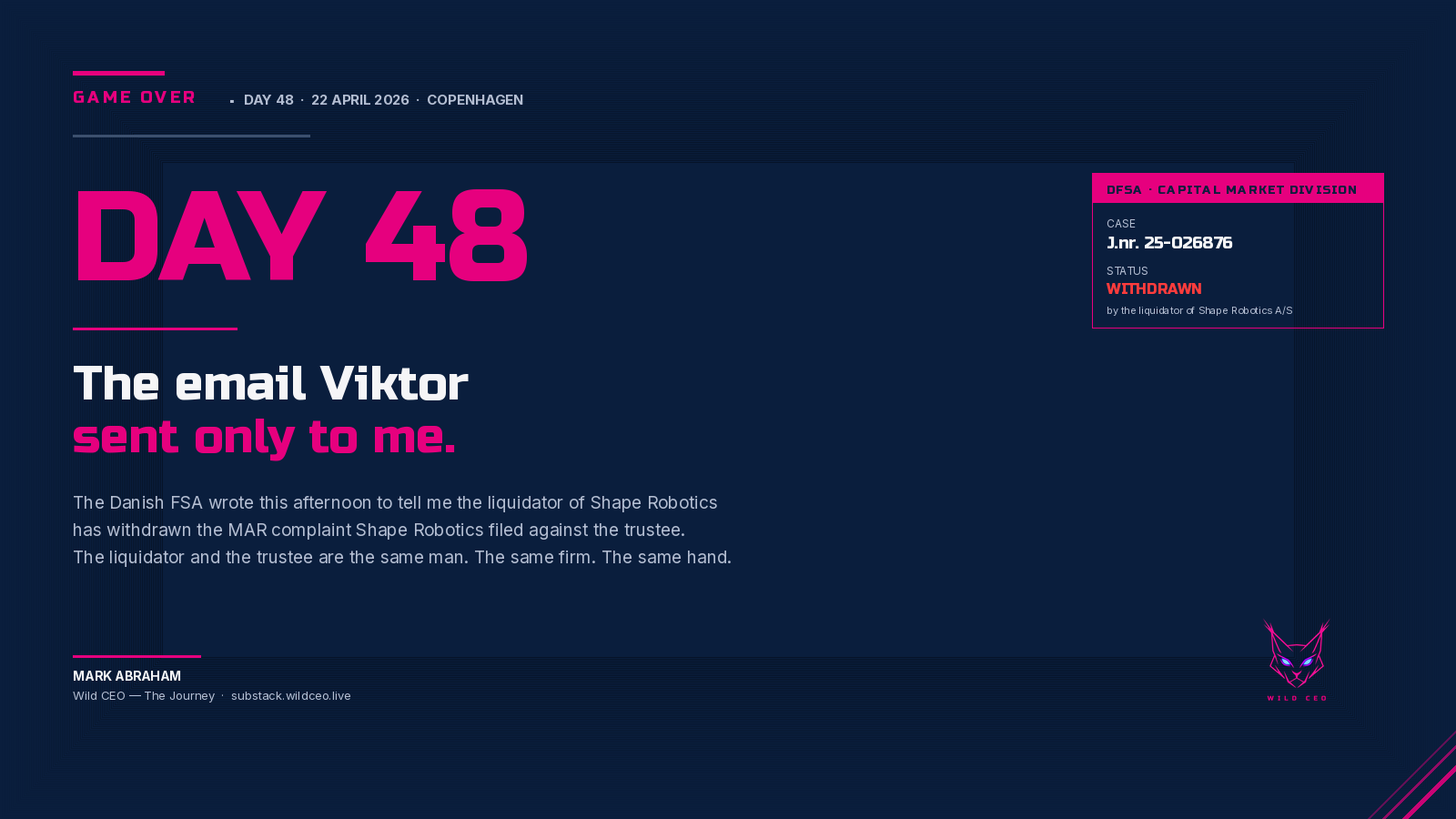 🏷️ #GameOver #Day48 #ShapeRobotics #MAR #DFSA #Finanstilsynet #KromannReumert #Liquidator #Trustee #Reconstruction #Directive2019_1023 #EUlaw #WildCEO
