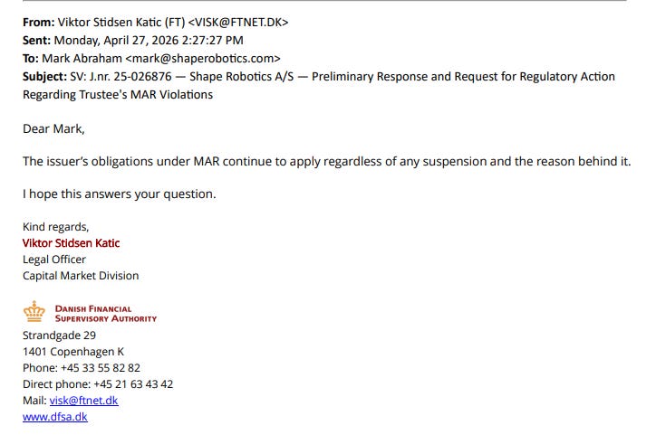Today the Danish Financial Supervisory Authority — Finanstilsynet, J.nr. 25-026876 — wrote to me twice. Not a press release. Not a leak. Two formal email replies from Viktor Stidsen Katic, Legal Officer in the Capital Market Division, in the same regulatory case file.